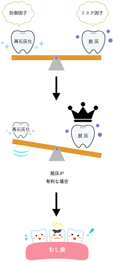 食事や間食でお口の中が汚れ、酸性に傾いている時間が長ければ長いほど、歯のミネラル分がだ液中に溶けだし、歯の脱灰が進行していきます。
