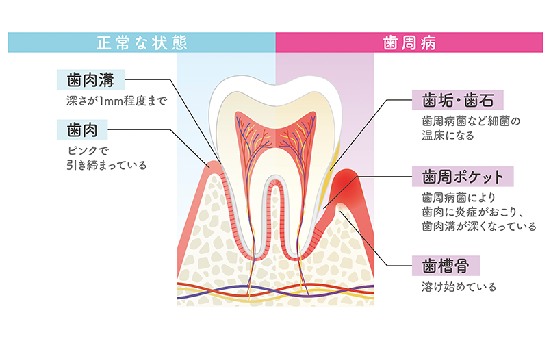 左側が健康な歯、右側が歯周病だよ。歯周病は、歯と歯ぐきのすき間から口腔内細菌が組織に入り込み、最終的に歯の骨が溶けて歯が抜けてしまう病気なんだ。